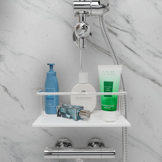 En acier inoxydable et acrylique ,cette petite étagère de douche se suspend à la barre de douche ou au robinet ,ce qui est très pratique.Dommage toutefois que la tige centrale ne puisse pas se régler en hauteur .La tablette peut accueillir plusieurs flacons ,et elle est percée pour laisser l'eau s'écouler. L'étagère est stable ,et elle supporte bien un certain poids. C'est fonctionnel !